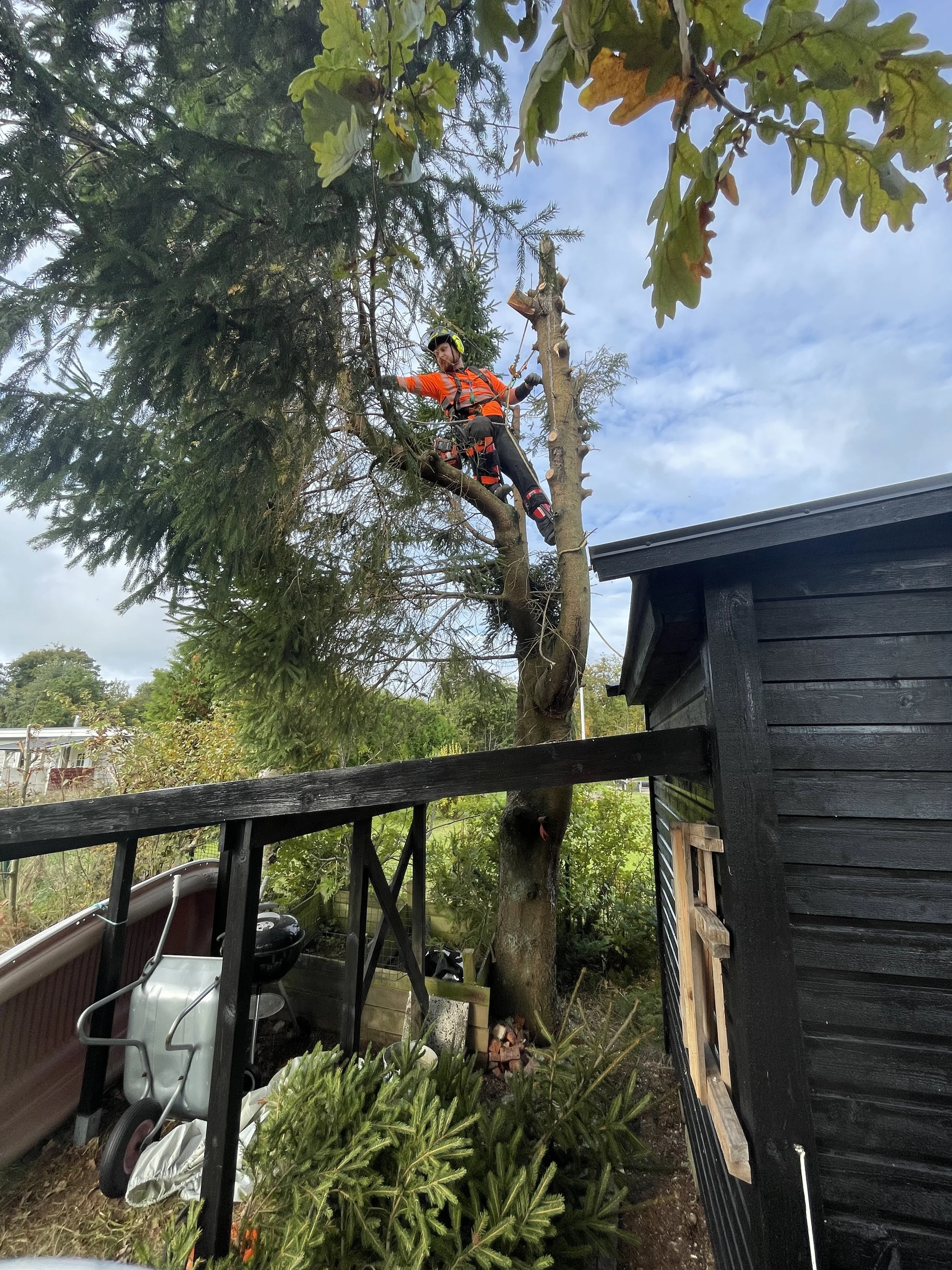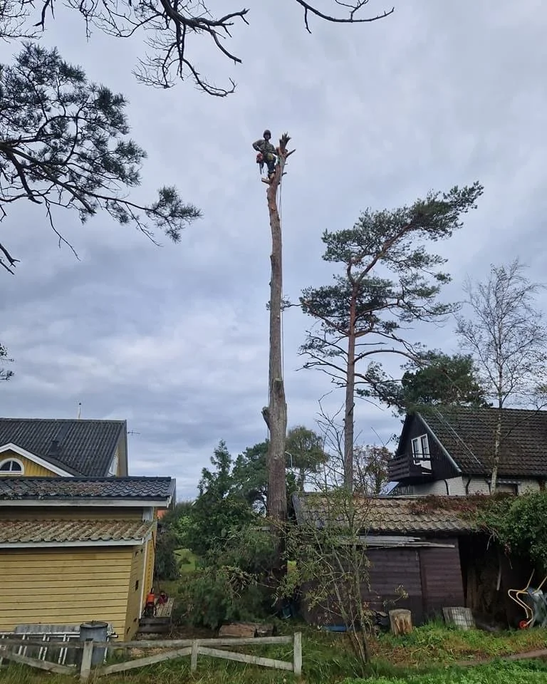 Sektionsfällning är en teknik som används när utrymmet runt trädet är begränsat eller när trädet står nära byggnader, kraftledningar eller andra hinder. Vid sektionsfällning klättrar våra erfarna trädfällare upp i trädet och fäller det i mindre delar, eller sektioner. De använder klätterutrustning och säkerhetslinor för att nå höga grenar och sågverktyg för att skära av grenarna en efter en. Detta kontrollerade tillvägagångssätt gör det möjligt att styra nedfallet av varje sektion, vilket minskar risken för skador på omgivningen. Sektionsfällning är en flexibel och säker metod som kan anpassas till komplexa miljöer och svåra arbetsförhållanden.
